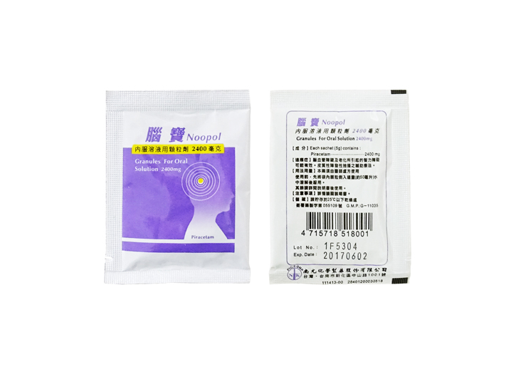 英文品名 :Noopol Granules For Oral Solution研发代号 :HAE-518许可证字号 :卫署药制字第055109号健保代码 :AC55109113主成份 & 含量 :Piracetam剂型 :内服颗粒剂剂量 :2.4 g包装规格 :30 Bag药品类别 :处方用药管制药品 :否产地 :台湾药理分类 :N06BX03适应症 :1.脑血管障碍及老化所引起的智力障碍可能有效。2.皮质性阵发性抽搐之辅助疗法用法用量 :使用前,先将袋内颗粒倒入适量(约50毫升)水中溶解后服用。